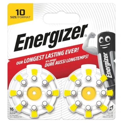 Energizer Hearing Aid Battery, size 10, 16 pack 16-pack of Energizer Hearing Aid Batteries size 10, yellow tab Longest Lasting: These longest-lasting hearing aid batteries size 10 from Energizer are suitable for a variety of hearing devices Trusted Power: Energizer hearing aid batteries size 10 deliver up to 3.5 hours more wireless streaming than the leading competitor Reliable: Each Energizer 10 battery holds power for up to 4 years in storage, so they’re always ready when you need them
