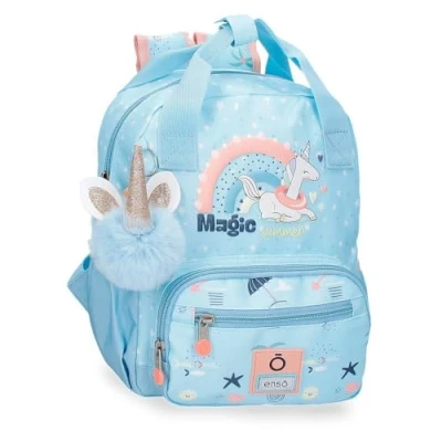 Backpack 23 cm x 28 cm x 10 cm made of polyester. The main compartment is the ideal size for storing essential things to go to school or personal belongings when travelling. Two front pockets for easy access to smaller personal belongings. Wide, ergonomic and padded shoulder straps that adapt perfectly to the back and the possibility of incorporating an optional trolley thanks to its rear strap and the Magic Fix system that allows greater fastening of the backpack to the trolley. Includes decorative pom pom