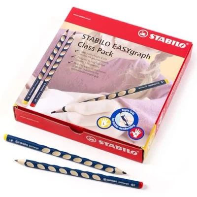 EASYgraph is the first ergonomic handwriting pencil with versions for right and left handers. Its triangular shape and moulded grip zones promote children to hold the pencil with the correct grip. The vanished moulded grip zones along the whole shaft ensure a relaxed hand posture. The yellow and red colour coding at the end of the pencil indicates, red for right handers and yellow for left handers. The handwriting pencil is available in an HB degree.