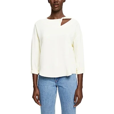 Round neck with button Keyhole at the back One sided cut out with twisted detail on the front Dropped shoulders 3/4 sleeves with elasticated cuffs