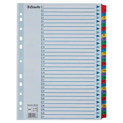 Amazon1-31 index for the clear organisation of A4 documents, helps in keeping track of important notes or school paperwork; for home, school or office use Coloured tabs for clear classification of documents; universal punched filing strip for easy filing in all types of binders and files Easy to update index by hand with extra long writing space Organize your home and office with this and other products from Esselte; durable and tear resistant 160 gsm cardboard Contents: One A4 Esselte 1-31 index, cardboard, 100164, W x D x H: 22.5 x 0.5 x 29.7 cm; colour - blue/multi-coloured; weight: 0.41 kg