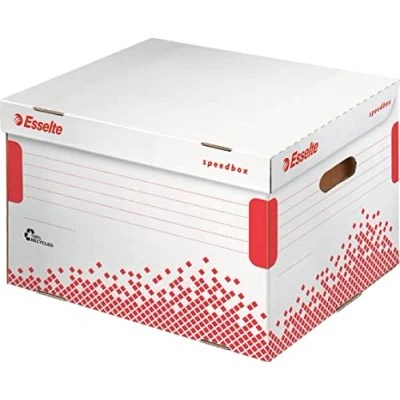 AmazonEsselte Speedbox Storage and Transportation Box for Binders, saving you time and effort, no instructions needed, long-term archiving solution for preserving and protecting documents and binders, holds up to 5x 75 mm lever arch files, ideal for museums, archives, libraries and offices Sturdy and thick recycled corrugated board for protection and preservation of documents, made from 100 percent recycled corrugated board, 100 percent recyclable and FSC certified Lightweight and easy to handle, fits suitably on most shelves, can be stored vertically or horizontally, labels on the side and front for quick identification of contents Easy to assemble in seconds, stackable for an ideal storage solution