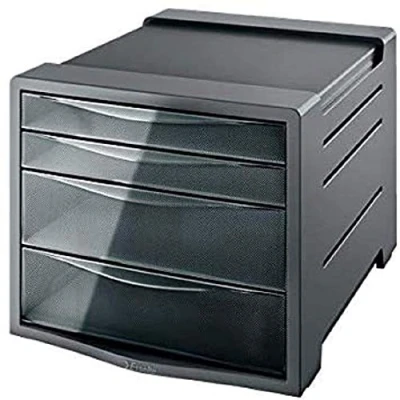 Four-drawer smoked grey drawer cabinet with transclucent drawers and solid housing for organising and storing A4 size documents, pens, makeup, medicine or remote controls for home or office use Fits standard filing cabinets, width: 41 cm from outer edges of hooks or 39 cm from middle of hooks Mix and match with other products from the Esselte Intego range for the an ideal office look Stack up to three on top of each other to save space, rubber feet on bottom keep cabinet from slipping, made of durable plastic for a elegant look that lasts, smooth, easy to clean surface Contents: One Esselte A4 Drawer Cabinet, Drawer Organiser, dimensions (W x H x D): 28.5 x 37.2 x 24.5 cm, Weight: 1.52 kg, material(s): Plastic, colour: Translucent Smoked Grey, Intego range, 28453