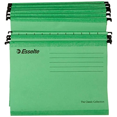 AmazonPack of 25 reinforced suspension files, each file holds up to 150 A4 sheets, ideal for medical records, financial statements and archives for organisation and storage of documents at home or in the office Fits standard A4 filing cabinets Wide opening for easy access to contents, made from strong card with reinforcement tape along the base to prevent tearing, solid metal clinch bars won't bend with weight Repositionable tabs for easy viewing of contents in drawer, blue angel certified 100 percent recycled 210 gsm card Contents: One pack of 25 Esselte Classic Reinforced Suspension Files, A4, dimensions (W x H): 34.5 x 24 cm, material(s): Heavy duty recycled card/metal, includes 25 tabs and 25 inserts, colour: Green, 90318
