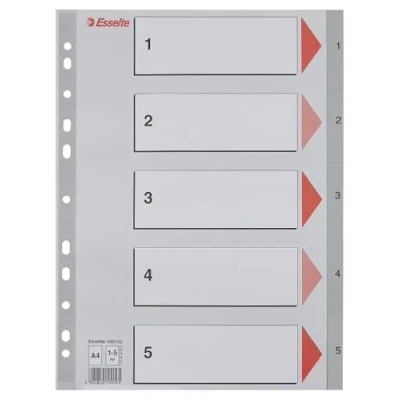 1-5 index for the clear organisation of A4 documents, helps in keeping track of important notes or school paperwork; for home, school or office use Numbered tabs for clear classification of documents; universal punched filing strip for easy filing in all types of binders and files Easy to update index by hand with extra large writing space Organize your home and office with this and other products from Esselte; wipe clean plastic surface is durable and tear resistant Contents: One A4 Esselte 1-5 index, plastic, 100103, W x D x H: 22.5 x 0.1 x 29.7 cm; colour - grey; weight: 0.04 kg