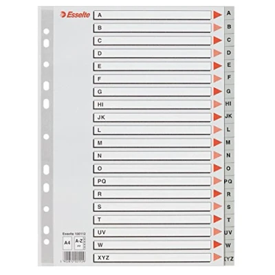 AmazonA-Z index for the clear organisation of A4 documents, helps in keeping track of important notes or school paperwork; for home, school or office use Numbered tabs for clear classification of documents; universal punched filing strip for easy filing in all types of binders and files Easy to update index by hand with extra long writing space Organize your home and office with this and other products from Esselte; wipe clean plastic surface is durable and tear resistant Contents: One A4 Esselte A-Z index, plastic, 100112, W x D x H: 22.5 x 0.3 x 29.7 cm; colour - grey; weight: 0.14 kg