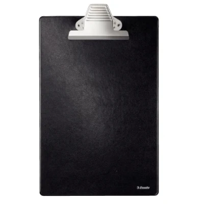 Black heavy duty clipboard with a glossy finish, contemporary design with round edges, holds up to 200 A4 sheets, easy to handle ergonomic shape, for home and office use Strong metal clip with rubber grip on top holds and secures papers, hanging hook for storage, easy to transport loose documents on the move Mix and match with other Esselte products High-quality plastic for an elegant look that lasts, easy to clean, smooth surface Contents: One Esselte heavy duty A4 clipboard, dimensions: (W x H x D): 232 x 3 x 349 mm, colour: Black, rigid plastic, 604037