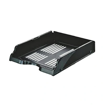 A4 letter tray in black with a matte finish, Space saving design, For the organisation of A4 documents at your office or home, Easy to handle ergonomic shape Keep a clean desk with this and other products from the Esselte Transit range, Use alone or in combination with other Esselte letter trays for flexible storage solutions Can be stacked vertically or stepped to allow simple organisation of documents, magazines and folders, Interior dimensions: 32.5 x 24.5 x 4 cm Sturdy plastic material does not bend when full, Easy document access via large front opening Contents: 1x Esselte A4 Letter Tray, Dimensions (WxHxD): 26 x 7.6 x 33.6 cm, Colour: Black, Transit Range, 15657