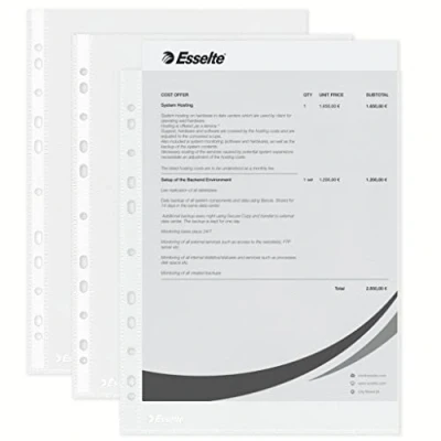 Plastic transparent pockets, ideal for organising and storing A4 documents, compatible with lever arch files and ring binders, for home, school and office Ideal for storing and protecting multiple documents up to A4 size Universal 11-hole punched holes with reinforced holes for storage in folders and ring binders Indelible, easy filling and storage of documents using the top opening Box contents: 1 x 100 Esselte standard document sleeves in A4 format, colourless with matte surface, top opening, 0.043 mm polypropylene film, 56171