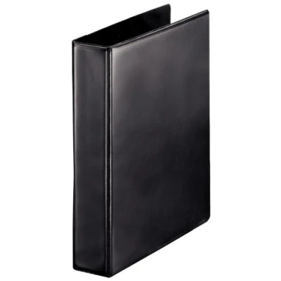 AmazonPresentation binder in black, leather style, 6 cm spine, A4, will carry 380 (80 gsm) sheets Two outside pockets for customisation Standard 4 D Ring mechanism for easy turning of single sheets, 4 cm ring diameter FSC certified, durable and scratch resistant cover Esselte presentation ring binder, black, 49763, W x H x D: 62 x 319 x 275 mm, 440 g, A4
