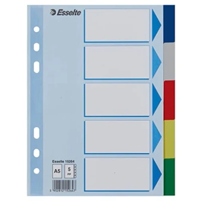 20 x 5-part index for clear organisation of A5 documents, ideal for use with binders or ring binders, for home, school and office 5 tabs in different colours (blue, grey, red, yellow, green) for organising documents, practical universal perforation for filing in ring binders and folders Practical cover sheet with space to describe the different contents Robust and durable dividers made of polypropylene plastic and cover sheet made of 250 g/m² cardboard for optimal order for home and office Box contents: 20 x Esselte dividers for order A4, cardboard cover sheet and plastic dividers, dimensions (W x H x D): 22.5 x 29.7 x 0.1 cm, colour: multi-coloured, 15264