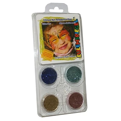 What would a costume be without the right makeup? With the glitter butterfly make-up set from Eulenspiegel you are perfectly prepared for the foolish time Included are the colours sea blue, Arctic blue, light pink and classic gold The glitter butterfly make-up set is suitable for face and body and is very economical. Contains no perfumes Conjure up a variety of make-up faces and let your imagination run wild