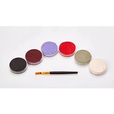 This is the make-up palette Mr. And Mrs. Vampire The set includes a cake - blood, a professional - brush, an instruction poster and five professional - aqua make-up colours. The colours are alabaster, black, zombie grey, light red and purple. The professional Aqua Make Up has been dermatologically tested and is vegan. The make-up was made in Germany.