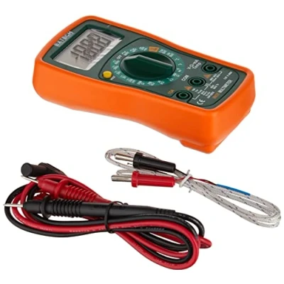 Large easy to read digital display AC/DC Voltage, DC Current, Resistance, Type K Temperature, Continuity/Diode 1.5 V and 9 V Battery test function Convenient mini size with protective rubber holster and tilt stand Data Hold locks reading in the display
