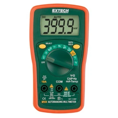 Compact autoranging multimeters with 10 functions including temperature Large easy to read digital display AC/DC voltage, DC current, resistance, capacitance, frequency, Type K temperature, continuity/diode Convenient mini size with protective rubber holster and tilt stand Data hold locks reading in the display