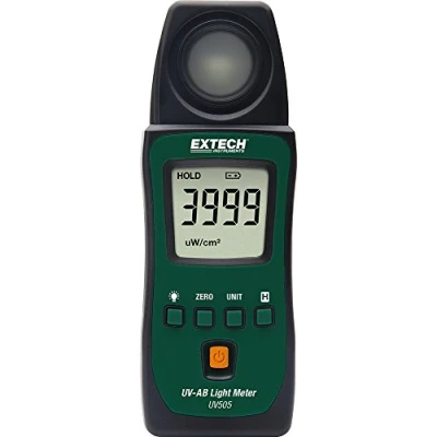 Sensor wavelength range 290 to 390nm UV sensor with cosine correction measures irradiance from UV-AB light sources up to 40.00 mW/cm2 Backlit LCD for easy viewing Zero function Data Hold freezes current reading on display