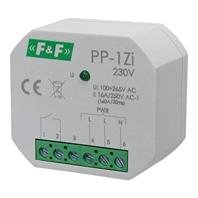 Power supply: 100÷265V AC; Maximum load current: AC-1 16A (160A/20ms) Design element: relay; contact configuration: 1 x NO contact; contact disconnect Mechanical resistance: min. 5 x 106 cycles; connection: screw connections 2.5 mm²; tightening torque: 0.4 Nm Power consumption: < 0.6 W; power supply indicator: LED; operating temperature -25 ÷ 50 °C Dimensions: diameter 54 (48 x 43 mm), height: 25 mm; mounting: flush mounting Ø60; protection grade: IP20; material: plastic; weight: 44g