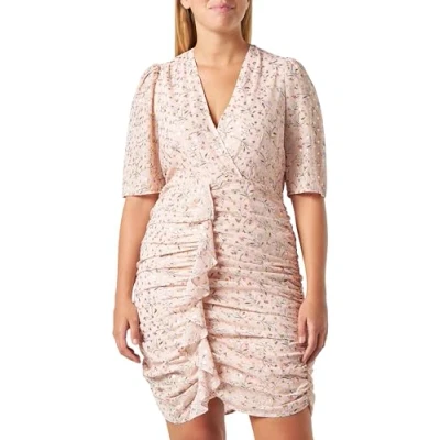 draped mini dress Delicate floral print With gold polka dots Semi-transparent material Wrap look with V-neck