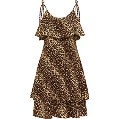 Leopard Print Midi Dress Cool, flowing material Flounce at neckline Adjustable spaghetti straps Layer in the lower skirt