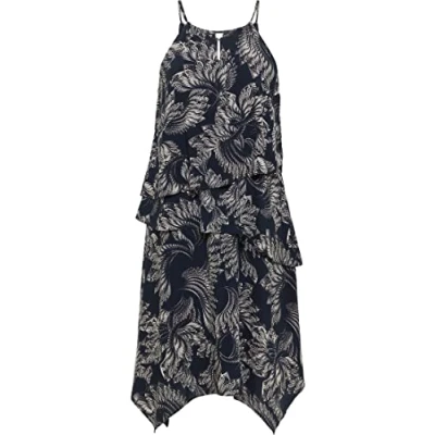 Lightweight dress with all-over print Asymmetrical layers Small V-neck Small hook at the neck Loose silhouette