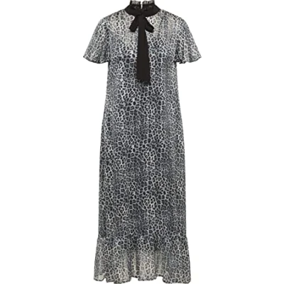 Cap Sleeve Midi Dress Ruffled stand-up collar Tie on collar All-over leopard print with gold-coloured threads Ruffle at skirt hem