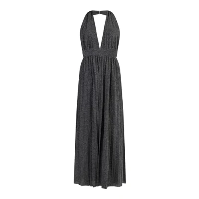 Long jersey dress With glittering effect yarn Halterneck with wearing options Concise waist Long pleated skirt