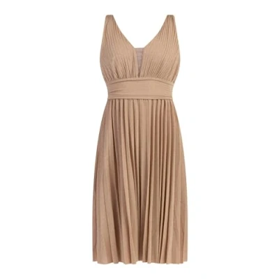 Knee length jersey dress With glittering effect yarn Concise waist Pleated midi skirt Plunging back plunge