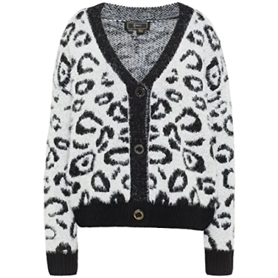 Soft jacket with fringe yarn All-over leo knitting pattern Closed with V-neck Large shimmering buttons Ribbed hem and cuffs