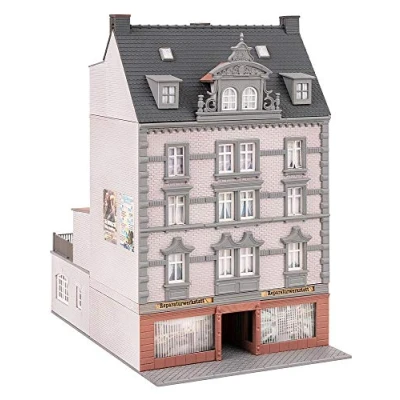 Gauge H0, Scale: 1/87, Epoch: II, Item Group: City, Town Houses Multi-storey town house with backyard buildings and a repair workshop on the ground floor. Individual windows can be displayed open. This kit contains: 246 pieces in 6 colours, window parts, 1 curtain mask and 1 assembly instructions (English language not guaranteed). Use Faller Expert plastic glue for crafting. Dimensions: 125 x 183 x 208 mm Expandable by: 1 x 180667, 2 x 180671, Manufacturer: Faller