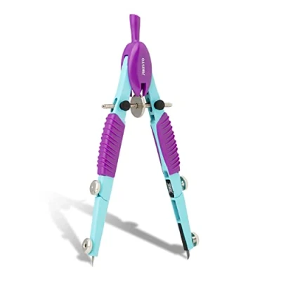 The Aristo Topline quick adjustment compass meets high function and quality standards and brings colour to mathematics and geometry lessons in school and university The high-speed spindle and the centre wheel for fine adjustment ensure ideal handling. Two black studded screws on the legs adjust the speed of the spindle Both legs have a joint and can hold inserts up to 4.0 mm in diameter, e.g. an extension rod or an adapter for drawing with pigment pens or ink fountain pens With the compass, circles up to 370 mm diameter can be drawn. The patented joints prevent annoying lateral bending of the leg when drawing Box contents: Aristo Topline compass item no. AR55776-19, side zinc die-cast turquoise lacquered, head and handle appliqué plastic, purple, pack of 2. Refills, transparent case