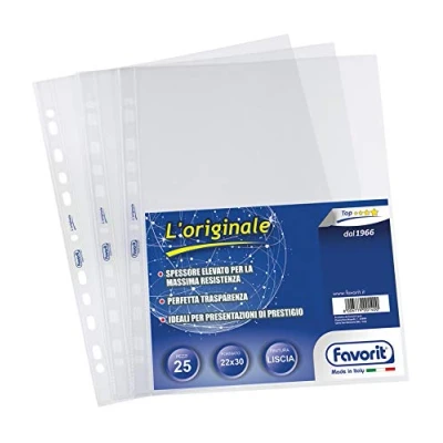 Punched Polypropylene (Non-Toxic Plastic), Top Opening for 22 x 30 cm, Multiple A4 Sheets, for Presentations by Prestige Top thickness: one of the highest on the market, high strength and high protection of the contents, made in Italy. Punched clear pockets, smooth surface and very good transparency, make the documents immediately visible, prevents copying effect as the toner does not stick to the envelope. The punched envelopes (or carp) are suitable for intensive use in the office, home and school, your stationery always at hand. Ideal for filing documents into 2, 3 and 4 ring binders, lever levers, folders and folders Pack of 25 with practical tear-off opening for easy tearing by cutting - ideal for storing and protecting the envelopes
