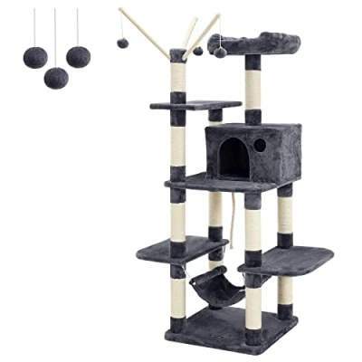 EXCLUSIVE LUXURY FOR CATS: Your feline friends need a cosy home of their own to play, take a nap or jump around; this cat house is sure to be their dream-come-true STABILITY IS ALWAYS PRIORITY: Constructed by sturdy natural particle boards and strengthened with battens at the bottom to ensure overall stability; anti-toppling fittings are included for double security ASSEMBLY CAN BE A BREEZE: All components are clearly marked, detailed instructions and tools are also provided — even a construction newbie can put this cat furniture together with ease ALL-IN-ONE RELAXING SPOT: Roomy condo, plush hammock and multiple perches offer luxurious napping experience; specially added fluffy toys and rope add so much more fun to their playtime SURPRISE YOUR FELINE FRIENDS: Treat your cats with this cat condo as a gift, and give them a cosy place to climb, scratch, and relax