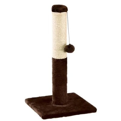 Scratching post with toy for cats. Sturdy structure with an essential design, ideal for small spaces. Stable square base covered with soft eco-friendly fur Equipped with a sturdy sisal column, it allows the cat to freely sharpen their nails without damaging furniture or furnishing fabrics Ball hanging from the top to ensure moments of fun for the cat Overall dimensions: 29 x 29 x h 53 cm.