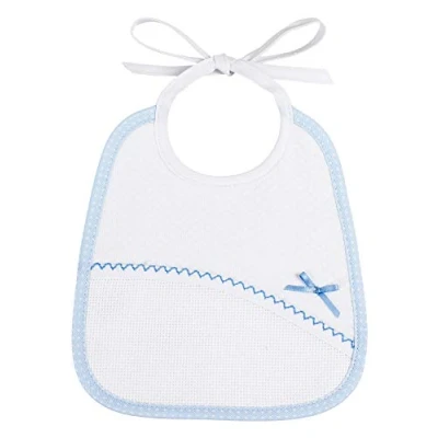 FILET 295BLEU Soft Fabric Bib with Aida Cloth Pocket for Embroidery, White and Sky Blue