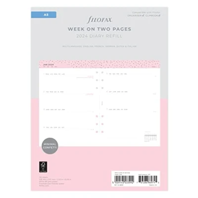 Filofax A5 2024 diary Week on two pages format Fun design at the top of each page Dotted and ruled pages at the end of each month Paper size 148mm x 210mm