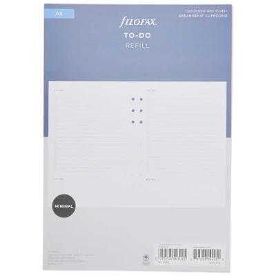 Keep up to date with daily chores and errands with this fun minimalist-style to-do refill Give your memories a home with the handy notes section, designed to make life just that little bit easier 56 sheets - White 80gsm paper Compatible with your A5 Filofax organizer of Clipbook. Height 210 mm/Width 148 mm Compatible with A5 organizers, A5 clipbook