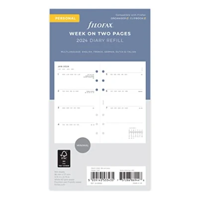 Filofax Personal 2024 diary Week on two pages format, multilanguage To Do, Goals and Big Plan pages White paper Paper size 95mm x 171mm
