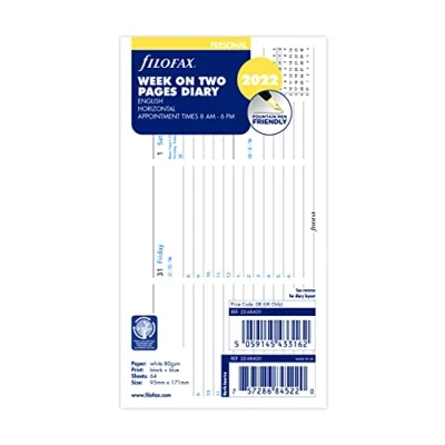 Filofax Personal 2022 diary Week on two pages with appointments format Horizontal layout Paper size 95mm x 171mm Made in the UK