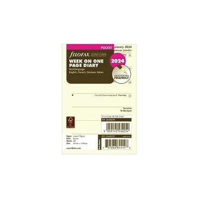 Filofax Pocket 2024 diary Week per page format English, French, German & Italian Cotton cream paper Paper size 81mm x 120mm