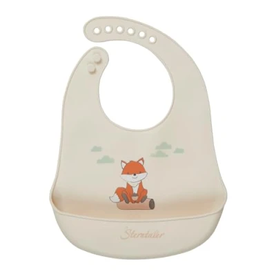 Silicone bib fox Filou. Made of food-safe silicone. Free from BPA. Easy to wipe clean and dishwasher safe. Flexible. Thanks to the practical collection compartment, you can also go something when feeding and the clothes and the floor are protected from food residue. Due to the adjustable closure, the bib can be used for a long time and fits comfortably and safely for babies and toddlers.