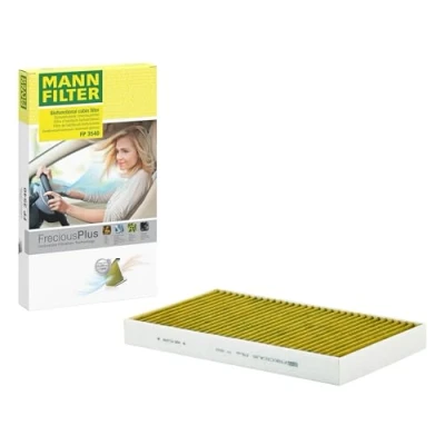 MANN-FILTER Cabin air filter FP 3540 / FreciousPlus biofunctional pollen filter / dimensions (mm): H = 35; A = 348; B = 207 / premium filter in original equipment quality Biofunctional MANN-FILTER FreciousPlus cabin filters protect almost 100% against nitrogen oxides, fine dust, allergens and mould. Harmful gases and unpleasant odours are also effectively eliminated and virus aerosols are filtered The three-layer filter technology binds allergens to almost 100%, reduces the growth of mould and bacteria by more than 98% and stops fine dust almost completely Find the right filter: replacement part via the selection of make, model, vehicle type and engine in the upper area or via the key numbers (HSN/TSN) from the vehicle documents MANN-FILTER Products meet all the requirements of the EU REACH regulation to ensure health and environmental protection in processes of development, manufacturing, use and disposal