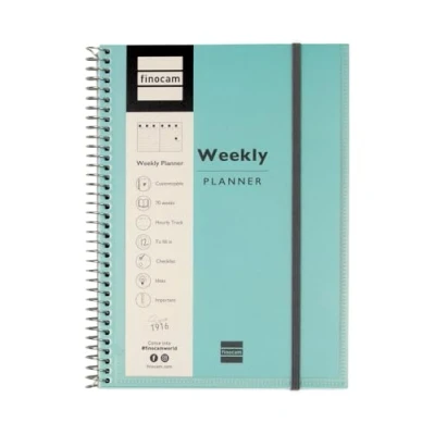 Inside: Vertical Week View. View of the entire week on two pages with the days in columns. With hourly slots. Undated yearly calendar for 69 weeks. International product in English. Multilingual Planner: English, French, Italian, German, Spanish, Dutch, Portuguese and Catalan. Contents: Personal data, timetables, double-page grid monthly planner for 12 months, empty pages, contact lists and stickers. Finocam products are designed to help you stay organised, making your life more practical, comfortable and pleasant. Any product bought from Finocam will be high quality, sustainable and environment friendly.
