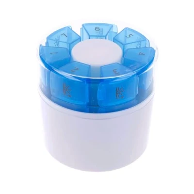 Practical 7-day pill box with pill organiser and pill mortar. Compact and clear solution for storing medication. Transparent lid provides a good overview of the medication. 7 numbered cassettes, each with 4 printed compartments for different times of day. The plug-in system makes it easy to remove individual cassettes when you are on the move.