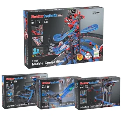 Exciting construction toy: This fischertechnik marble run contains lots of action components from which your child can construct different tracks for fast-paced ball races alone or with friends. The complete set includes the Marble Competition marble run and your add ons booster, battle and sound in one Exciting extras: with the 3 marble run extensions booster, battle and sound, the possibilities of the marble run have become even more exciting! Whether it is to make the balls difficult with chicanes, skilfully shoot the ball into a funnel or expand it with great sounds - the complete set offers unlimited fun Unexpected uses: with the wide high-speed flex profiles and the 180° curves, the balls can overtake themselves. To keep it exciting until the end, various obstacles can brake or stop a ball and give the race extra appeal Play and learn: with this explorer toy, your child can playfully develop creativity, motor skills, spatial thinking, logical and technical understanding – according to our motto "grasp technology playfully" Box contents & safety: 1 x Marble Competition, marble run accessories: 1 x Add On Booster, 1 x Add On Battle, 1 x Add On Sound, for children aged 8 and up, race track for balls to assemble. This toy is made entirely in Germany, complies with the applicable toy guidelines and is therefore completely safe for your child, Manufacturer: fischertechnik