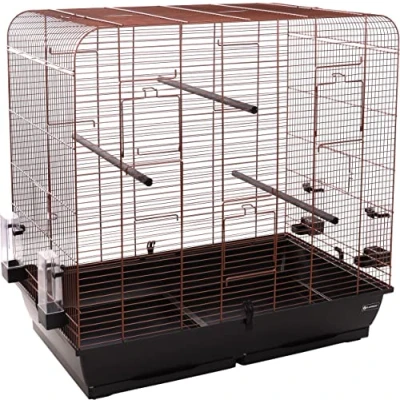 Material: metal and plastic 3 wooden perches & 4 large feeding bowls or feeding bowls Pole dimensions: 16 x 485 mm 5 doors: 3 front doors and 2 side doors With pull-out tray for easy cleaning