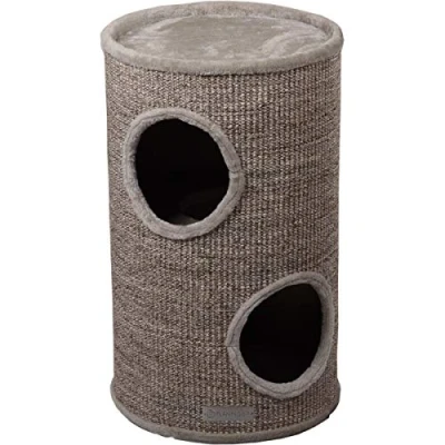 Material: sisal The outside of the scratching barrel is covered with a sisal scratching mat Padded platform and hideouts with soft plush (210 g/m²)