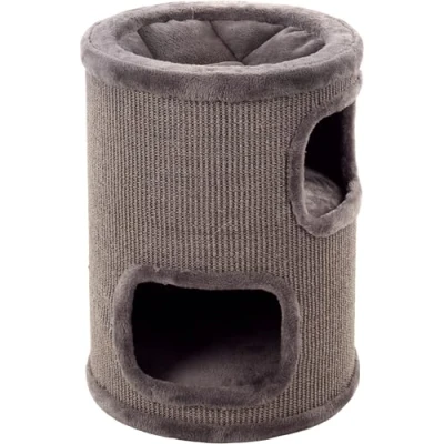 Material: Sisal The outside of the scratching barrel is covered with a sisal scratching mat Padded platform and padded hiding places Finished with soft plush