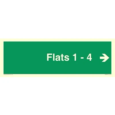 E909 : Right arrow (90 deg supplimentary) This sign is made from vinyl photoluminescent sticker Landscape Letterbox Sign Text: Flats 1 - 4