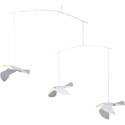 A beautifully designed mobile with three, Made out of Serigraphical foil. Measures:, Recall your holidays with the sight of, The Flensted Mobile centre has created Recall your holidays with the sight of these three seagulls. Close your eyes and hear them call For adults or children, this high end mobile is handmade in Denmark. It is perfectly balanced so that all elements are in constant motion. A Flensted Mobile is made from a combination of love, dedication and quality, bringing a unique design into your home while helping you to unwind at the same time. The mobile creates inner peace with its graceful, therapeutic, and calm movements. Each mobile is fully assembled, ready to hang, and requires no additional assembly. Not simply a nursery mobile, each Flensted Mobile is a piece of kinetic sculpture art that will liven any home, office, nursery, or classroom. Each is beautifully packaged, and makes an excellent gift for teachers, coworkers, or anyone who appreciates quality craftsmanship, and style. Flensted Mobiles are a traditional handicraft in Denmark. The first modern designer mobile was made there in 1954. Today Flensted Mobiles is based on the Danish island of Funen, the birthplace of Hans Christian Anderson, where it creates its very own design fairy tales from the old village school in Brenderup. We are represented all over the world, and take pride in bringing you handmade Danish design for your home - and your heart.