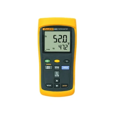 Dual-input digital thermometer for lab, QA, process calibration, food safety and HVAC Shows any combination of T1, T2, T1-T2, plus MIN, MAX, or AVG on the large backlit dual display Features fast response and laboratory accuracy (0.05% + 0.3°C) Includes a relative time clock on MIN, MAX, and AVG to provide a time reference for major events Comes with splash- and dust-resistant case protected by an impact-absorbing holster and a three-year warranty